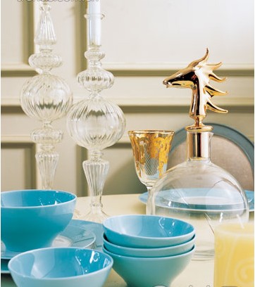 古典餐桌的現(xiàn)代式優(yōu)雅 餐桌的線條帶著鮮明的復(fù)古風(fēng)潮,在背景墻的襯托下有種歲月沉淀的優(yōu)雅韻味。灰白的主色調(diào)也給餐桌布置上留下更多揮霍色彩的空間。天空一般純凈的藍(lán)色餐具,嬌嫩的花朵搭配細(xì)頸寬口花瓶,華貴的金色酒杯以及晶瑩剔透的燭臺,讓古典餐桌霎時渲染上現(xiàn)代式的優(yōu)雅。顏色純美干凈的餐具會讓人有種想品嘗美食的沖動,為了營造更加純凈的氛圍,燭臺、酒杯與酒瓶都選擇無色透明的玻璃材質(zhì),而一點金色的點綴更增添了一份高貴氣質(zhì)。