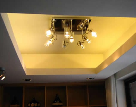 現(xiàn)代住宅普遍層高都在2.8米左右,如果客廳屋頂再采用造型天花來裝飾,就會因屋頂壓得太低而讓人有強(qiáng)烈的壓迫感。對于這種情況,可采用四邊低而中間高的天花造型,這樣一來,不但視覺上較為舒服,而且天花板中間的凹位形成聚水的“天池”,對住宅大有裨益。若再在聚水的“天池”中央懸掛一盞金碧輝煌的水晶燈,則會有畫龍點睛之效,但切勿在天花板上裝鏡。另外,吊燈也不宜有尖銳的形狀。