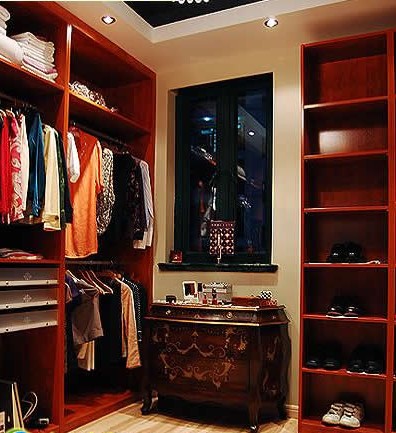 這種類型的衣帽間利用一面空墻存放,不完全封閉。優(yōu)點是空氣流通好、寬敞,缺點是防塵差,因此防塵是此類衣帽間的重點注意事項,可采用防塵罩懸掛衣服,用盒子來疊放衣物,為便于區(qū)別,可增加一些標志。若多設一些抽屜、小柜,則更為實用。